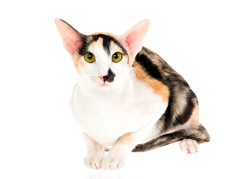 Los ojos, oblicuos y separados, son almendrados, de color verde y mirada penetrante. Los ejemplares con manto blanco pueden tenerlos de color azul e incluso uno verde y otro azul. Pero lo que más llama la atención son las orejas. De tamaño muy grande, son de forma triangular y terminan en punta. Están bien separadas y poseen una base ancha.