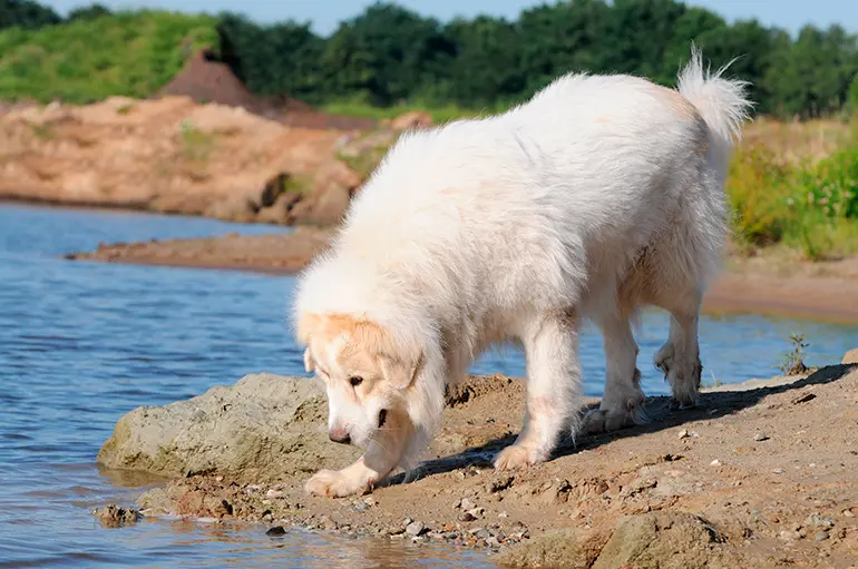 perro-Montaña-de-los-Pirineos-junto-al-lago